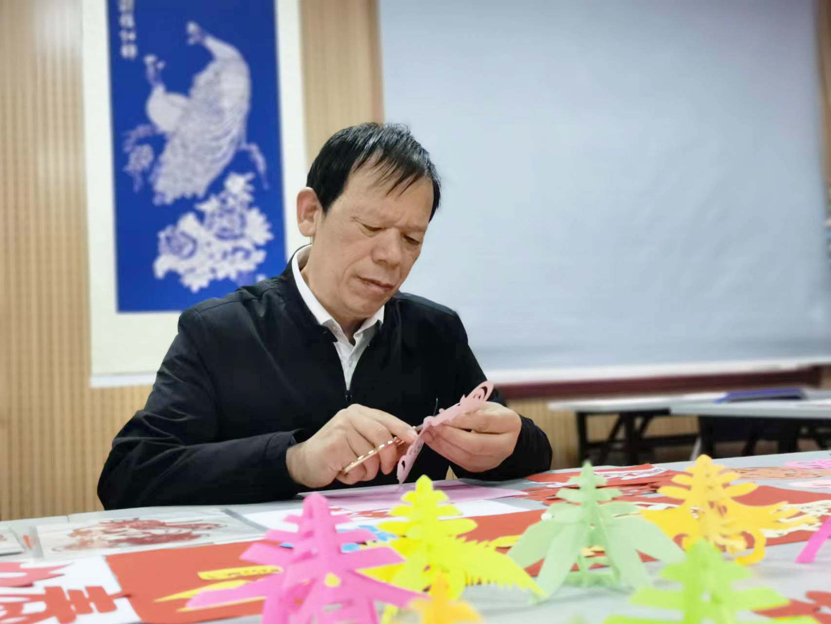 退休后,他更是积极参与蔡甸区新时代文明实践中心文艺大讲堂,担任非遗剪纸老师,作为文艺志愿者免费教授剪纸技艺,进一步传承和发扬非遗传统文化,让群众在文化艺术氛围中吸取智慧和力量。