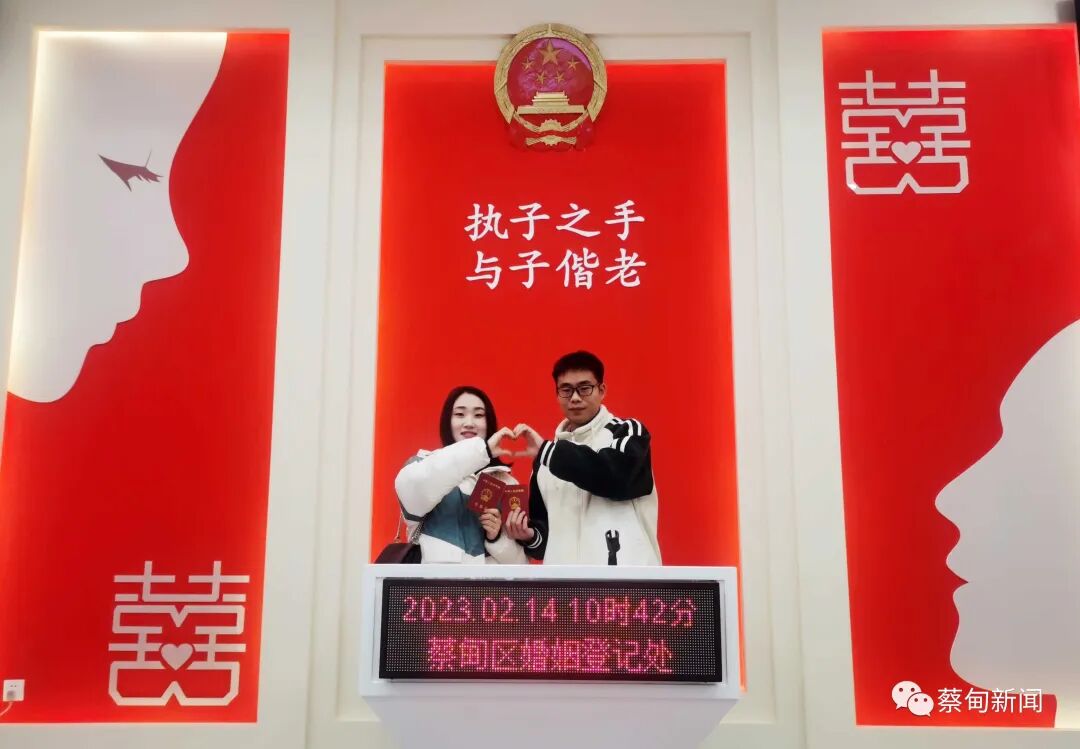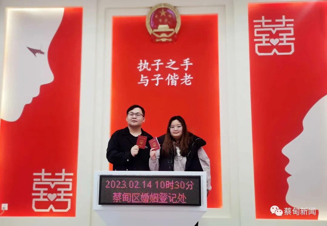 “我们在一起已经有四年了,特地选择今天过来领证,希望以后的日子每天都像情人节一样开心、甜蜜。”新人胡依凡和艾天幸福的笑容溢于言表。