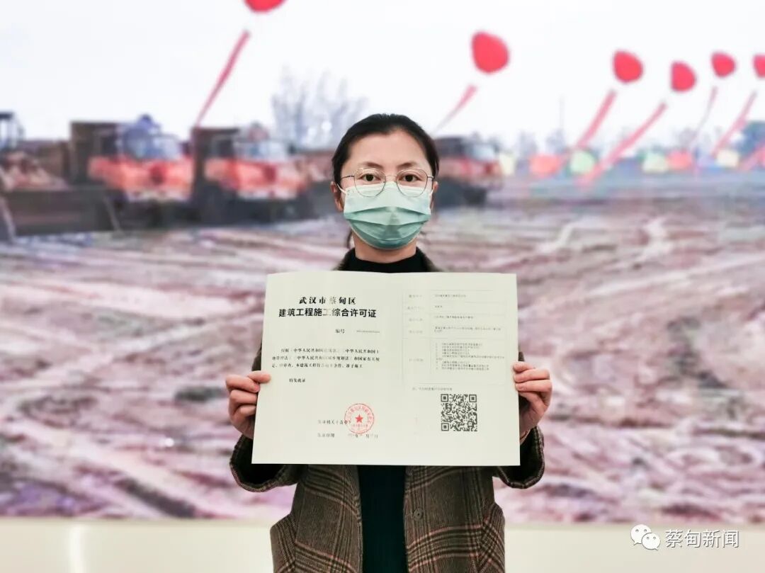 武汉精杰重型工程有限公司精杰智能装备项目的经办人黄女士在蔡甸市民之家领取了蔡甸区首张《建筑工程施工综合许可证》,扫描证上二维码可以看见固定资产投资项目备案证、不动产权证、建设用地规划许可证、建设工程规划许可证、人防许可决定书、质量监督登记表、安全施工措施登记表和建筑工程施工许可证8个证照信息。