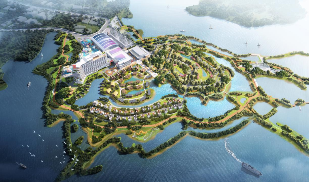 武汉中法半岛文旅投资有限公司中法半岛生态小镇项目总投资16.7亿元,用地面积约342亩,总建设规模约15万方,打造具备室内外水乐园、儿童乐园两大运动娱乐功能,集水趣游乐、高端住宿、商务会议、巧思美食、自然科普为一体的大型近郊高端亲子生态度假综合体。项目现已开工建设,预计2025年6月建成。