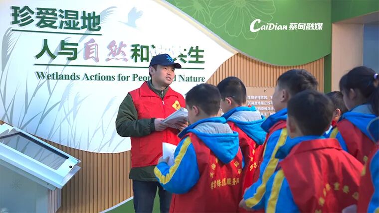 工程师冯江正在为学生宣传湿地保护知识