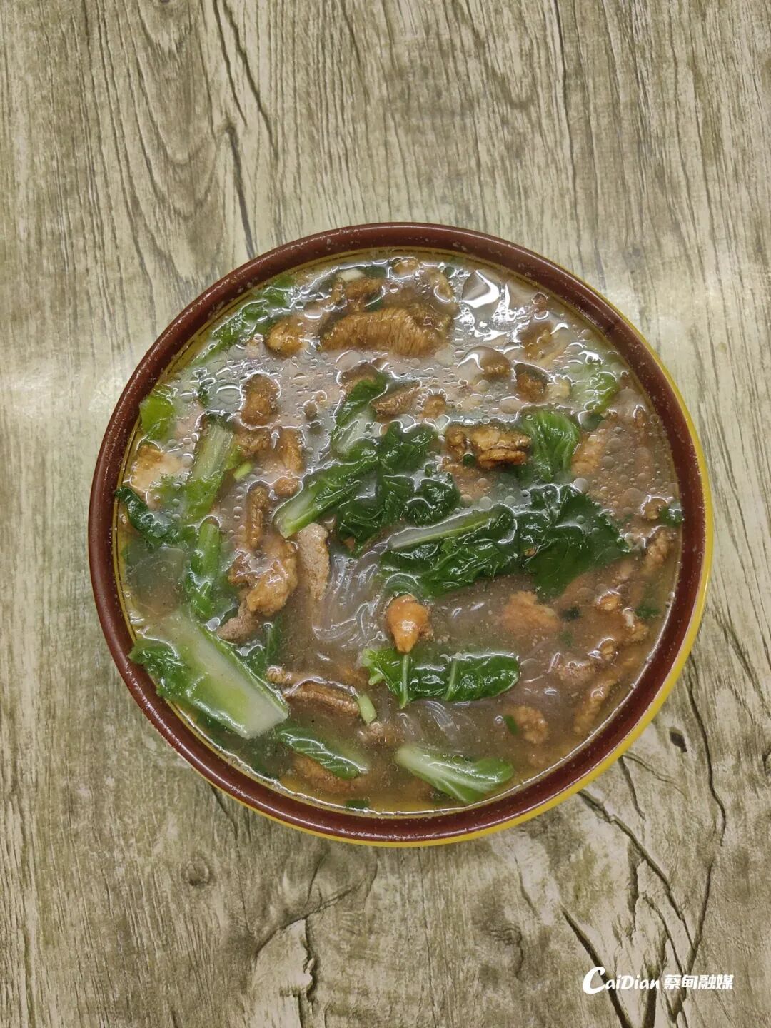 特色老三鲜用猪骨、老母鸡慢炖而来的高汤打底,绿豆粉丝吸满鲜汁,土猪肉片嫩而不柴,裹着汤汁入口超满足。