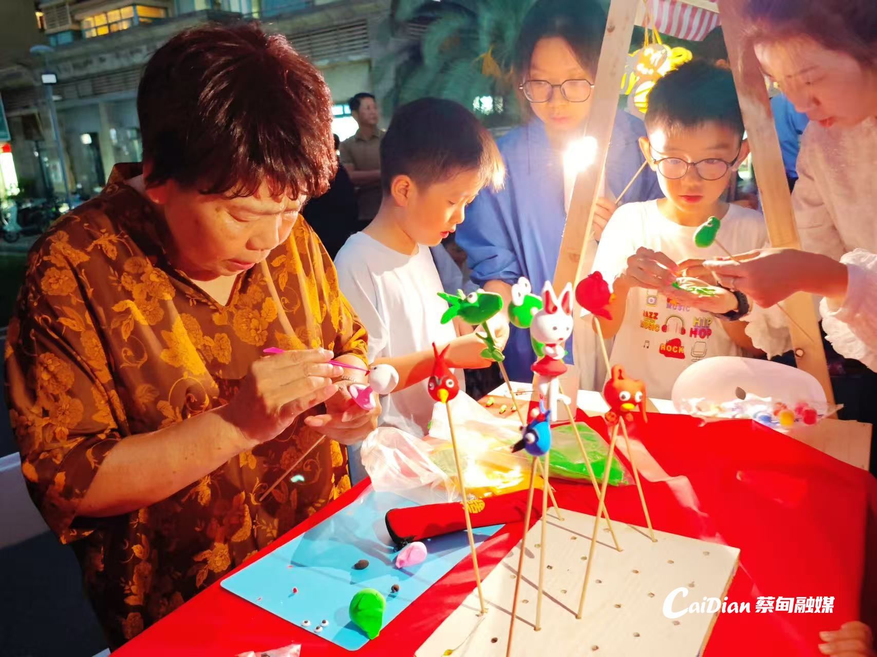 民俗体验区人头攒动,满是节日烟火气。糖画师傅以勺为笔,缕缕糖丝转眼化作栩栩如生的造型,孩子们手捧糖画笑逐颜开;捏面人摊位前,彩色面团在巧手中变成活灵活现的小动物,深受喜爱。“我和妈妈一起做了玉桂狗,特别好玩!”刚体验完的小朋友乐乐兴奋展示作品。