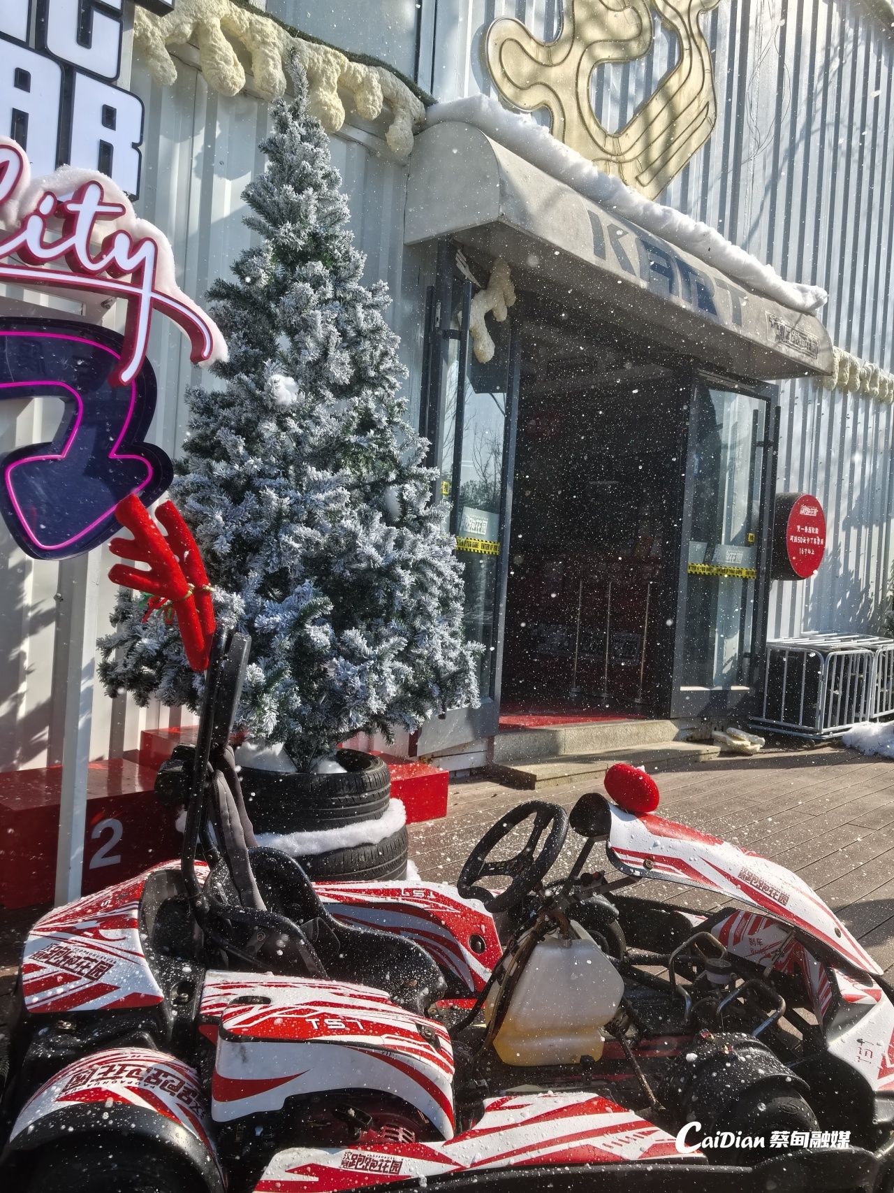 园区围绕冬日主题进行场景布置,赛道周边装饰雪松与雪花元素,卡丁车也覆上“积雪”,营造出童话般的冬季氛围。每日整点启动、持续15分钟的人工降雪环节,成为活动中最受期待的亮点之一,游客可在此打卡雪景、与卡丁车合影,沉浸式体验冬日限定浪漫。